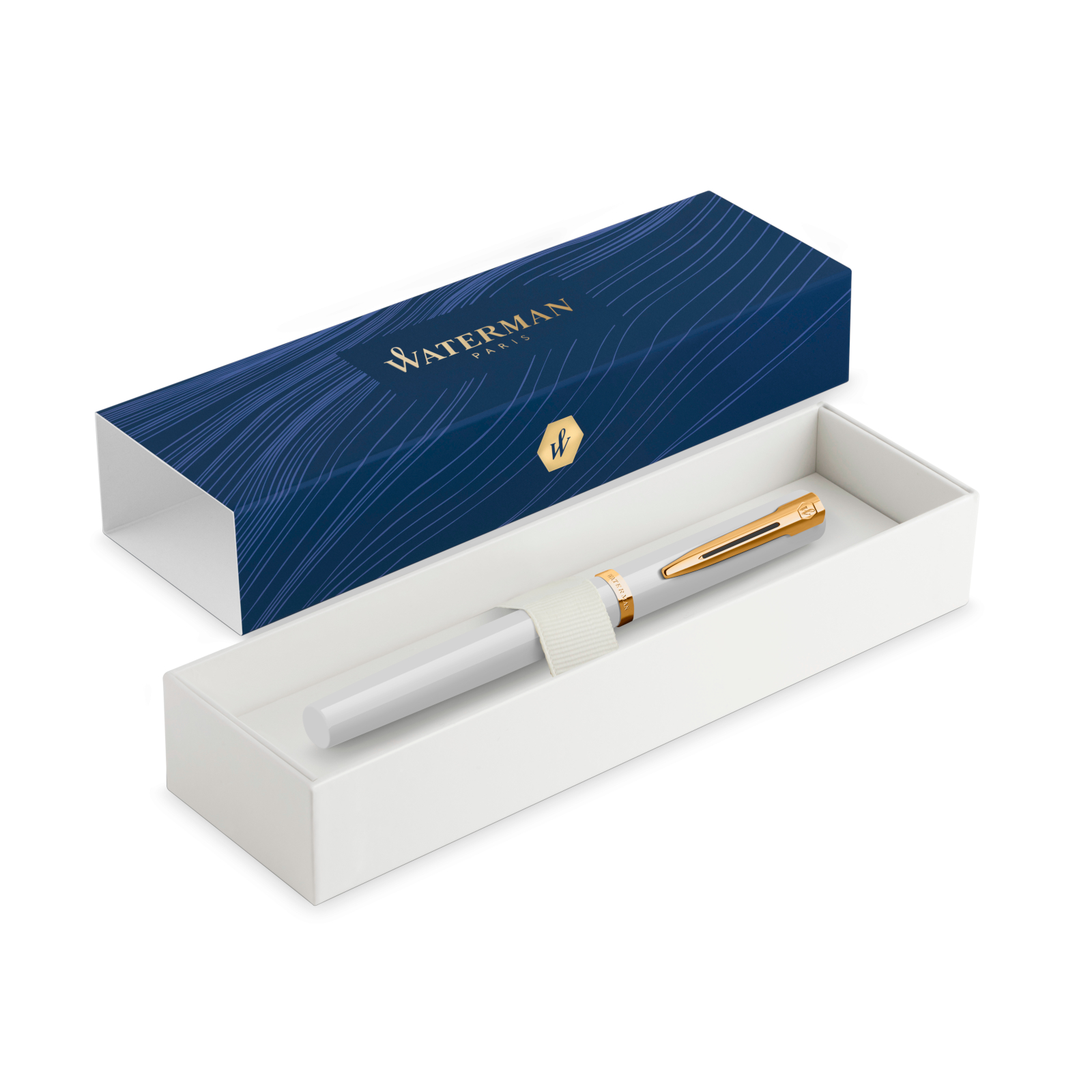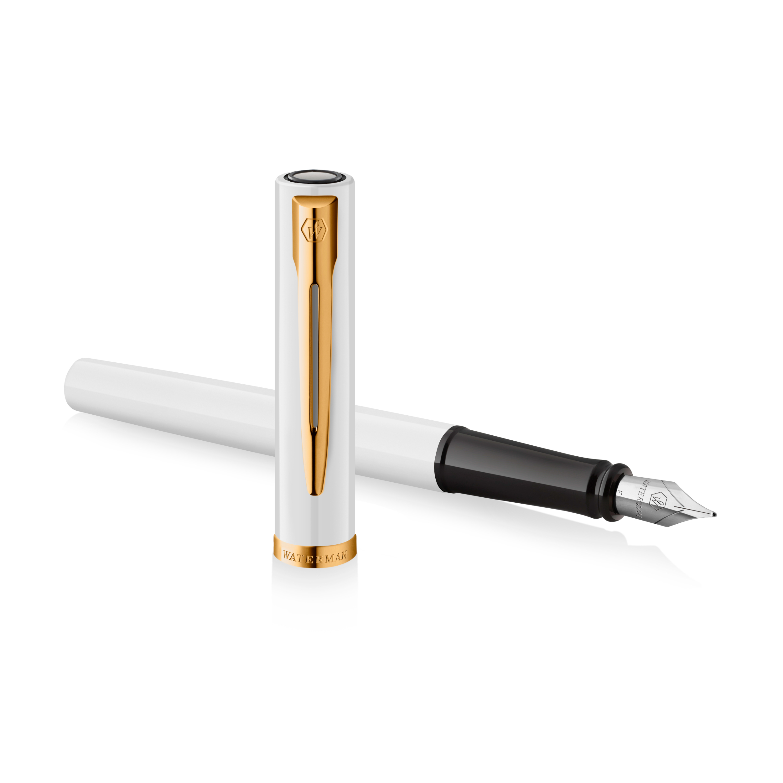 - Une silhouette élégante dotée d’un corps et d’un capuchon rehaussés d’une finition laquée blanche brillante. Le clip Waterman emblématique à double branche et un large anneau plaqué or sur le capuchon confèrent une distinction raffinée à ce magnifique instrument d’écriture.