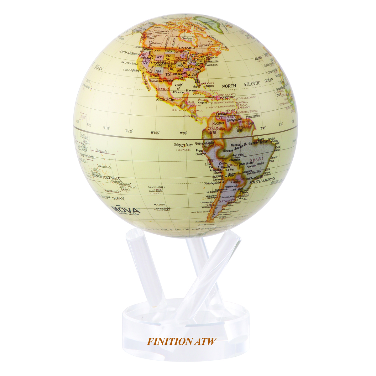 Le globe MOVA n'a besoin d'aucun câble d'alimentation ou de batteries. Il fonctionne grâce à la lumière naturelle ou artificielle qui l'entoure. Les cellules solaires à l'intérieur du globe sont activées par la lumière et fournissent de l'énergie à un mécanisme d'entrainement. Ce mécanisme fait marcher la rotation du globe qui comprend un élément magnétique qui réagit avec le champ magnétique de la Terrre comme une boussole et fournit le couple avec lequel il fonctionne. Pour toutes ces raisons le globe MOVA est un objet d'art captivant et fascinant. Il est disponible dans 3 tailles et dans de nombreuses finitions. Chaque globe est vendu avec un pied acrylique afin de mieux l'exposer. Emballage garantissant une totale protection pour le transport. Format 4.5 Inch.