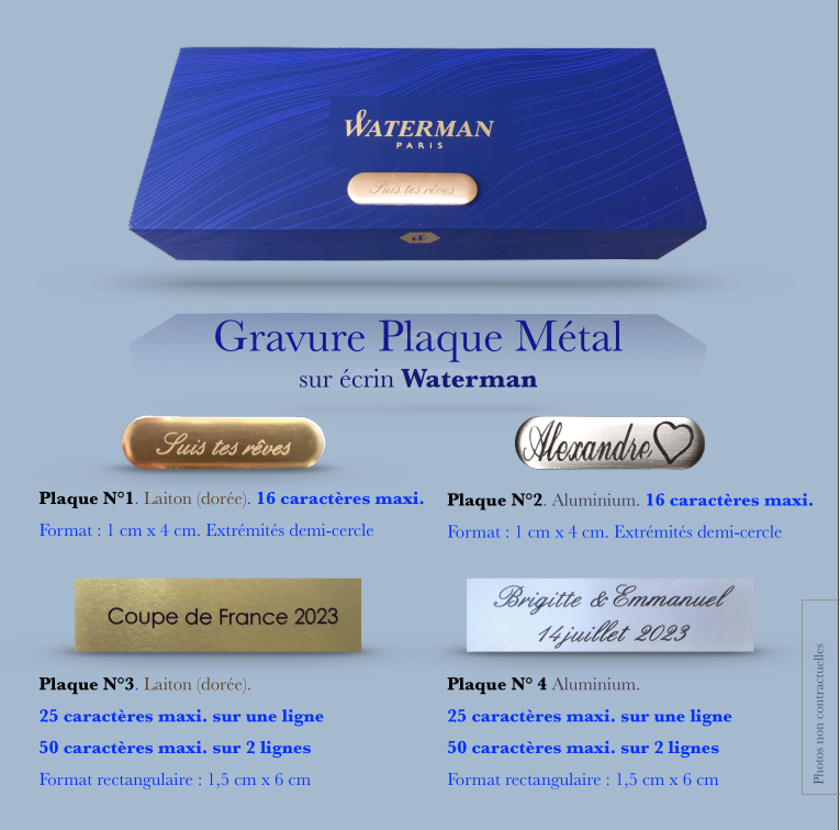 Cette offre s'adresse à tous ceux qui souhaitent personnaliser un cadeau et laisser une trace dans le temps d'une attention particulière. Cette option peut être un complément à la gravure d'un stylo ou la remplacer lorsque celle-ci est impossible. Exemple : le stylo peut être personnalisé avec un prénom et la plaque de l'écrin recevoir le marquage d'une date ou d'un texte attentionné. Les caractères particuliers, comme un coeur, sont possibles; la gravure d'un logo également sur demande (syll.valadier@wanadoo.fr). Plaques d'un format différent également disponibles sous certaines conditions.