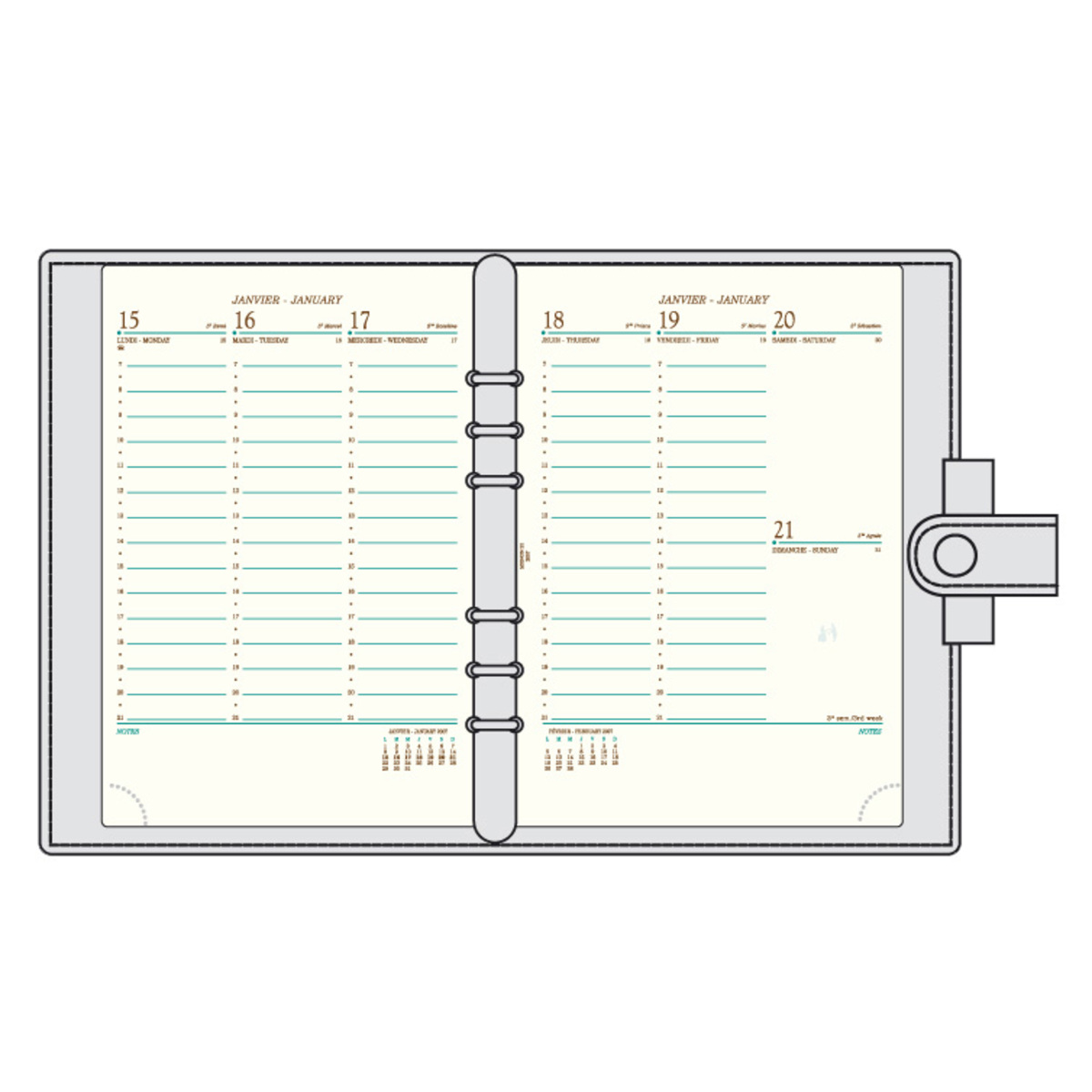 Recharge calendrier 2025 pour agenda Mignon à anneaux. Format AK21 (H: 21 cm). Un semaine sur 1 page + 1 page de notes.