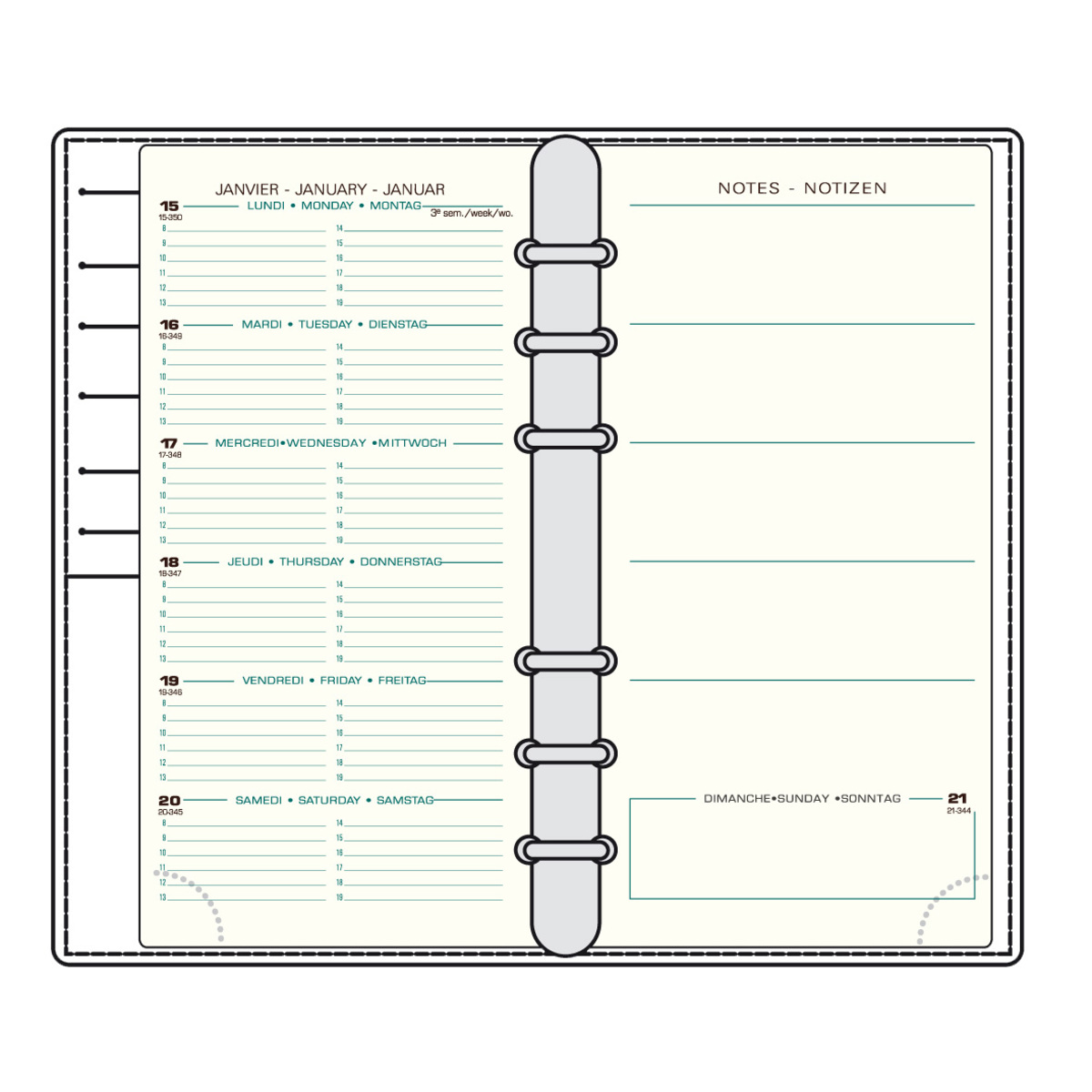 Recharge calendrier 2026 pour agenda Mignon à anneaux. Format AK18 (H: 18 cm). Une semaine sur 1 page + 1 page de notes.