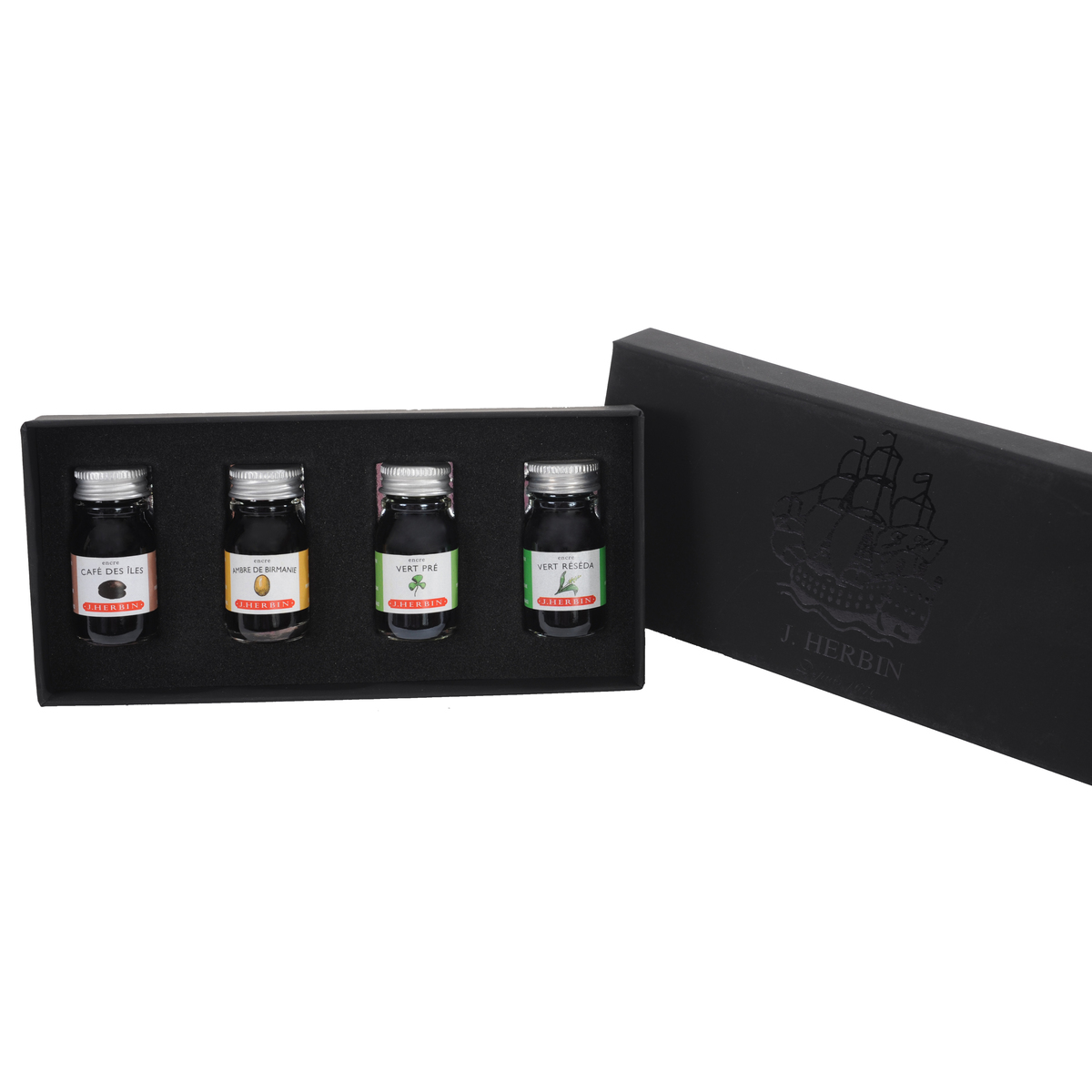 Coffret comprenant 4 flacons d'encre J. Herbin : Café des Iles, Ambre de Birmanie, Vert pré, Vert Réséda. Une encre pour stylo est un subtil équilibre entre la retenue sur la plume et la dépose sur le papier. Tantôt lumineuse, discrète ou intense, l'encre couchée sur le papier doit rester stable avec le temps. Les encres H. Herbin sont principalement composées d'eau, d'humectant afin de limiter le séchage au niveau de la plume et de conservateur pour préserver leurs qualités dans le temps. Les colorants utilisés ont spécialement été sélectionnés pour offrir la gamme de couleur la plus riche du marché.