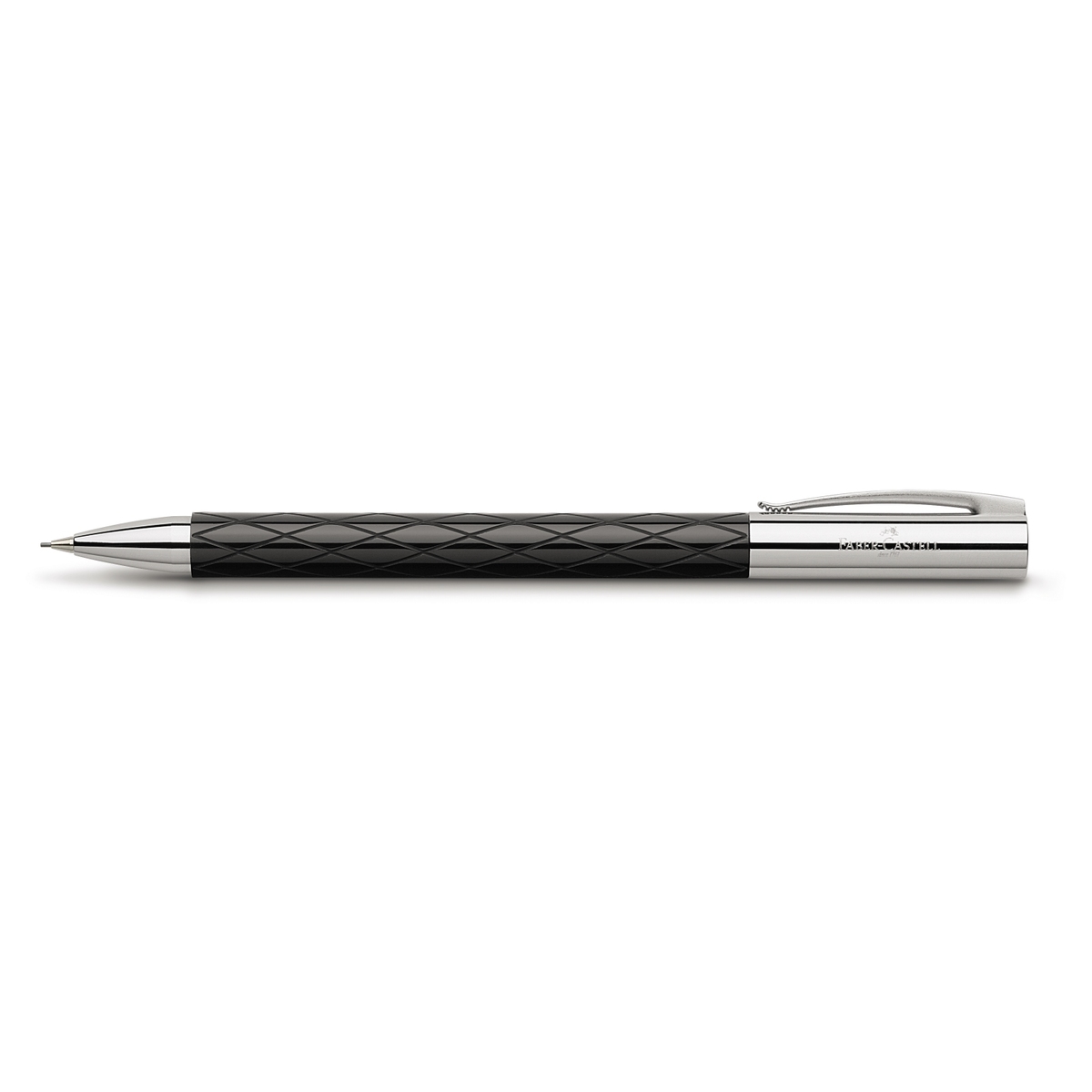 Portemine à mécanisme à rotation. Corps en résine dépolie, noire, gravé au diamant aspect "Losange". Attributs chromés. Mines 0,7 mm. Gomme dans le capuchon. Clip à ressort. Livré dans son écrin luxe et avec la garantie Faber-Castell.