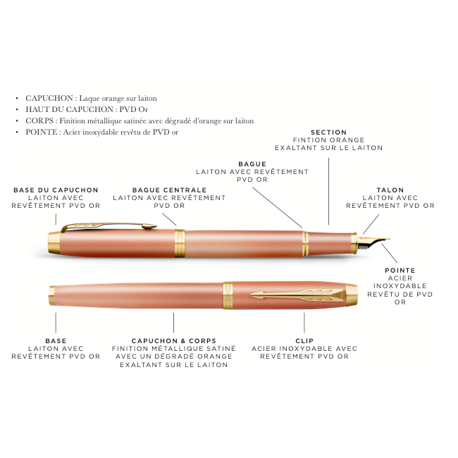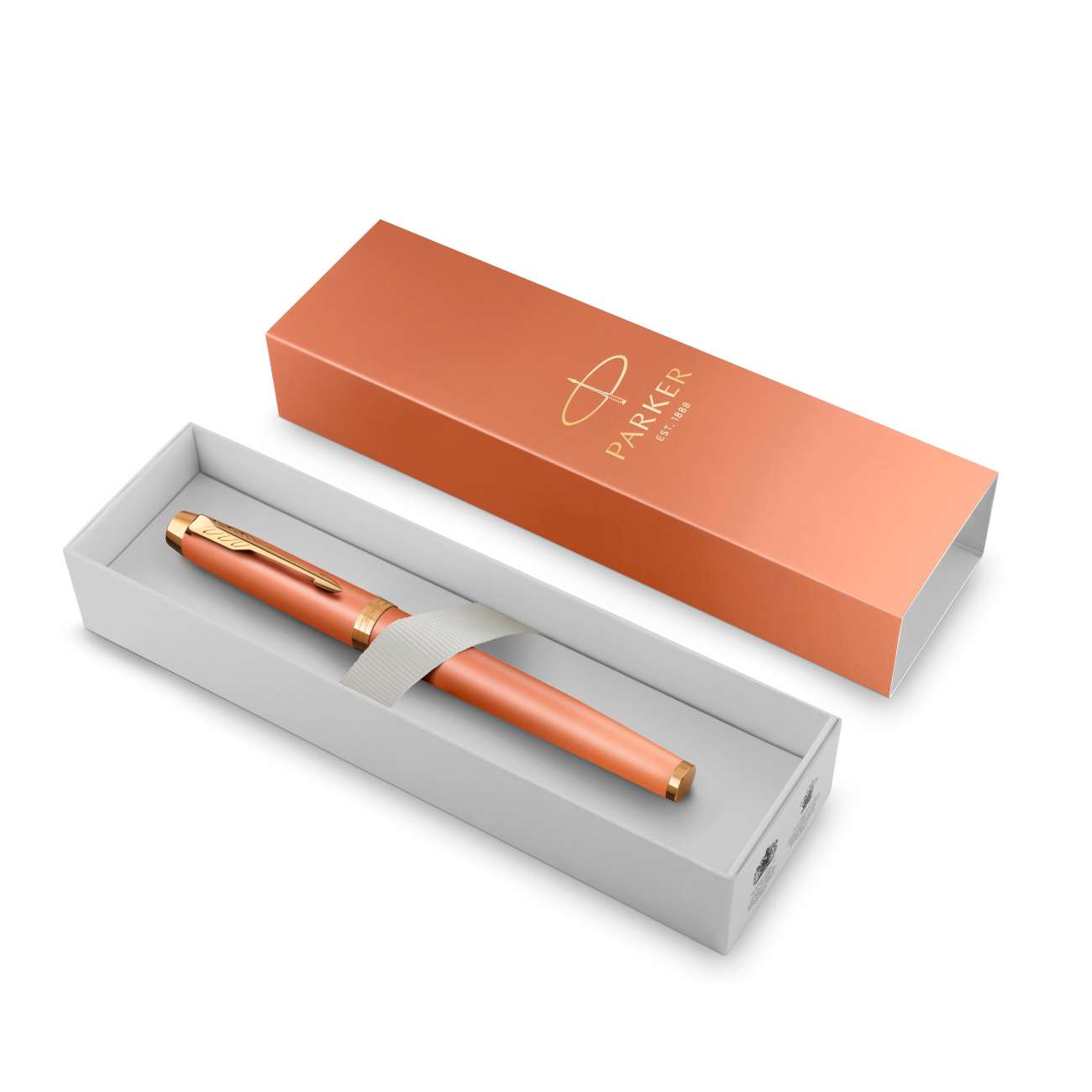 Le poids du stylo, son esthétique, sa prise en main et la fluidité de la livraison de l’encre contribuent tous à une sensation luxueuse et de concentration lors de l’écriture. La collection Parker IM Writing Rituals se décline en trois modèles : Stylo plume, Stylo roller et Stylo bille.