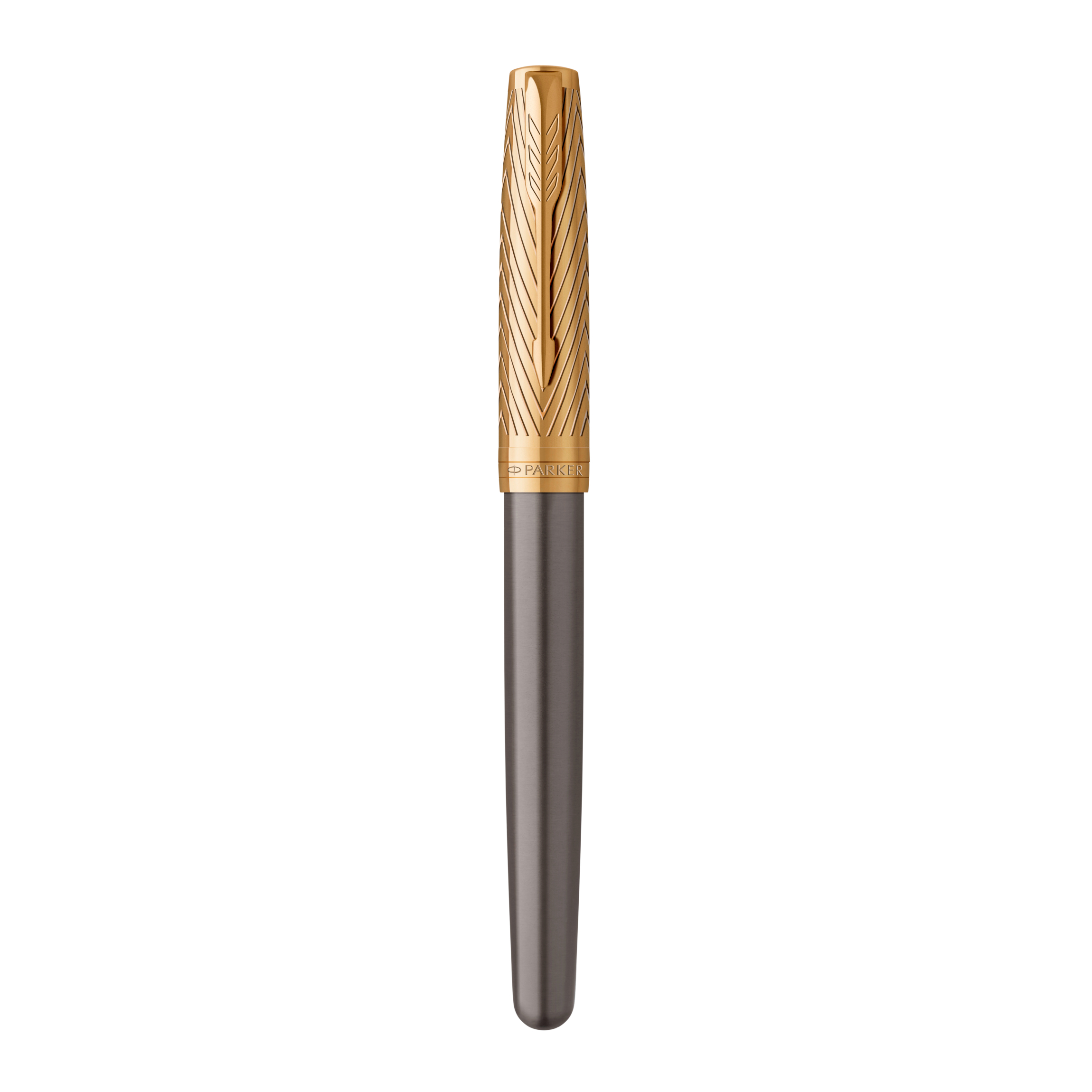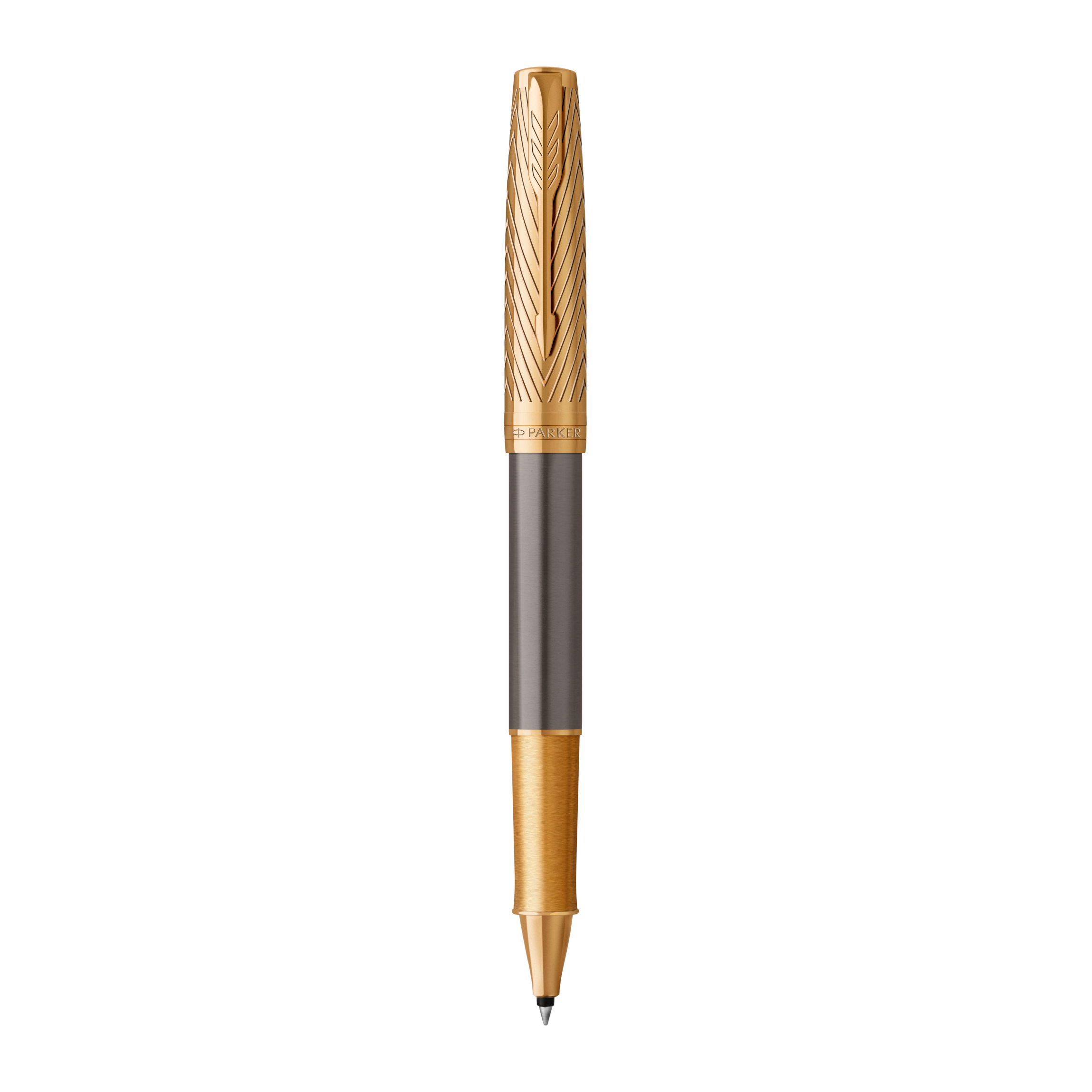 Roller Parker Sonnet Collection Parker Pioneers, Laque grise avec capuchon et finitions or, Pointe fine, Encre noire. Ancré dans les valeurs Parker, le capuchon délicatement gravé du Parker Pioneers fait écho à la fameuse flèche orientée vers le haut, symbole de l’état d’esprit avant-gardiste de George Parker et de son attitude de pionnier. Il se compose d’un capuchon et de finitions en or plaqué 23 carats, le tout complété par un corps gris laqué. Assemblé à la main et qualité contrôlée sans défauts. La pointe roller assure un écoulement fluide et régulier de l’encre sur le papier. Ce modèle Parker Sonnet est présenté dans un prestigieux coffret cadeau Parker, avec un manchon rehaussé du fameux motif chevron. Outre le Sonnet, le coffret comprend également une recharge d’encre noire à pointe fine pour stylo roller et le livret de garantie.