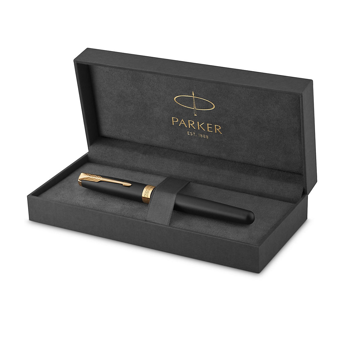 Roller Sonnet Noir Mat. •Symbole intemporel de l'élégance Parker. •Corps et capuchon avec poudre de résine noire mate effet satiné. •Agrafe en forme de flèche et attributs finition or. •Taille de la pointe : fine. •Livré avec une recharge roller d'encre noire. •Présenté dans son élégant étui Parker. Stylo fabriqué en France dans le centre d'excellence de Saint-Herblain (44).