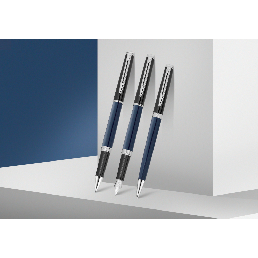 Waterman Hémisphère Stylo Roller, Laque Noire et Bleue avec attributs Palladium Pointe Fine. Un stylo roller de caractère inspiré par le style coloré audacieux de cette saison, affichant une couleur raffinée et une silhouette fine. Corps Bleu avec Capuchon Noir, clip à double branche emblématique et finition plaqués palladium. Pointe de stylo roller fabriquée avec un savoir-faire exceptionnel et associée à de l’encre liquide pour un confort et une ergonomie absolus. Fabriqué en France, grâce au savoir-faire de Waterman et à plus de 130 ans d’expérience. Présenté dans un étui cadeau Waterman haut de gamme, le cadeau parfait à offrir ou à s’offrir.