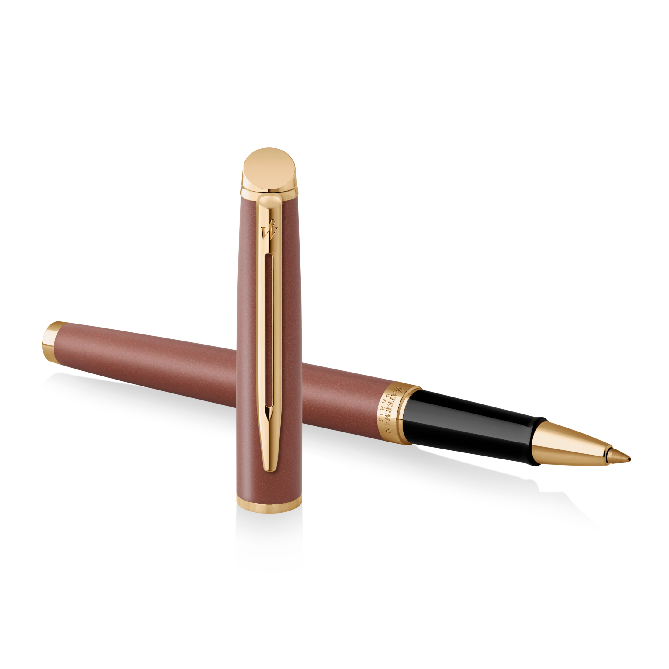 Corps et capuchon rouge cuivre finis en laque métallique, clip et finitions à double branche, recouverts d’un plaqué or clair