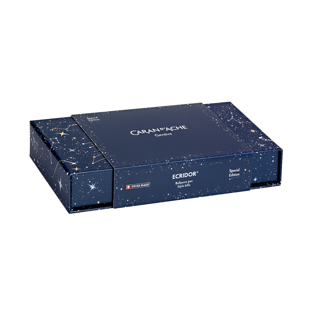 Boîte en carton premium bleu nuit recouverte de motifs galactiques dorés et blancs avec tiroir à ruban
