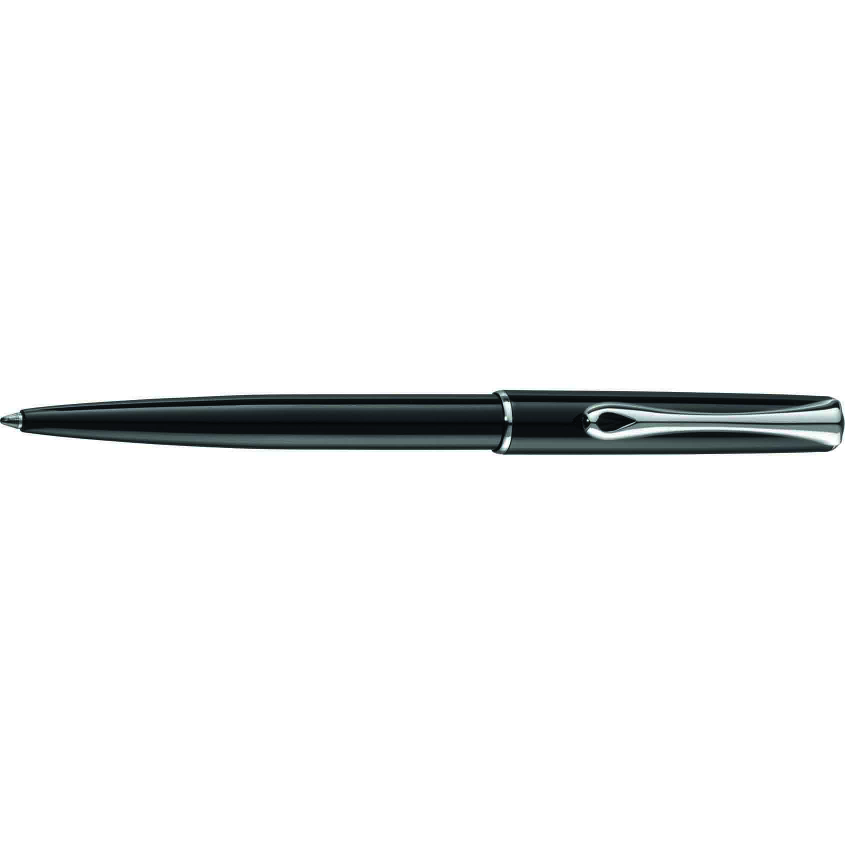 Stylo au corps fin et élégant en métal, attributs chromés polis, finition laquée brillante multicouche de haute qualité.