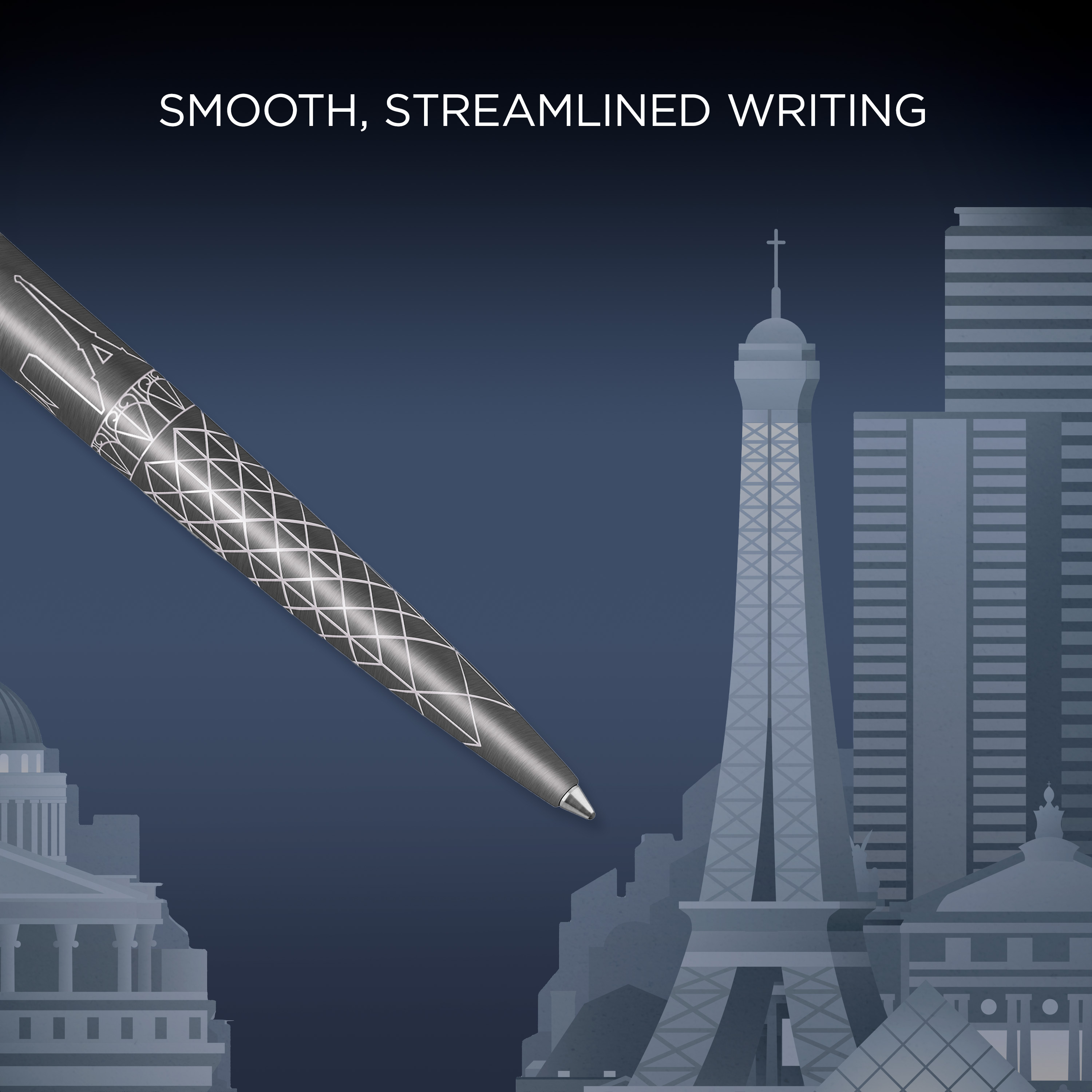 - La silhouette de la ville habilement gravée au laser et sa finition laquée gris témoignent du savoir-faire de Parker et confèrent au Jotter l’élégance caractéristique des stylos de luxe.