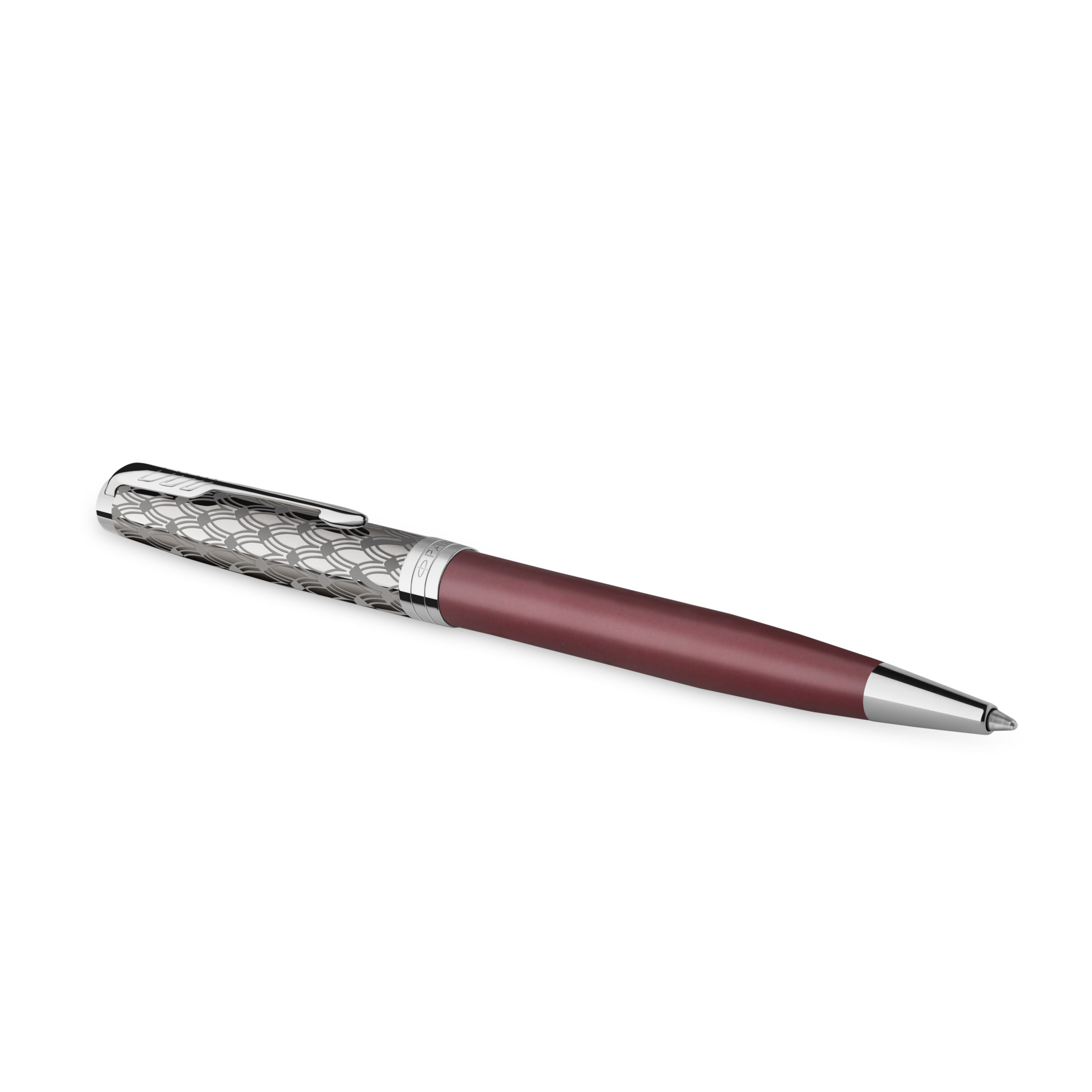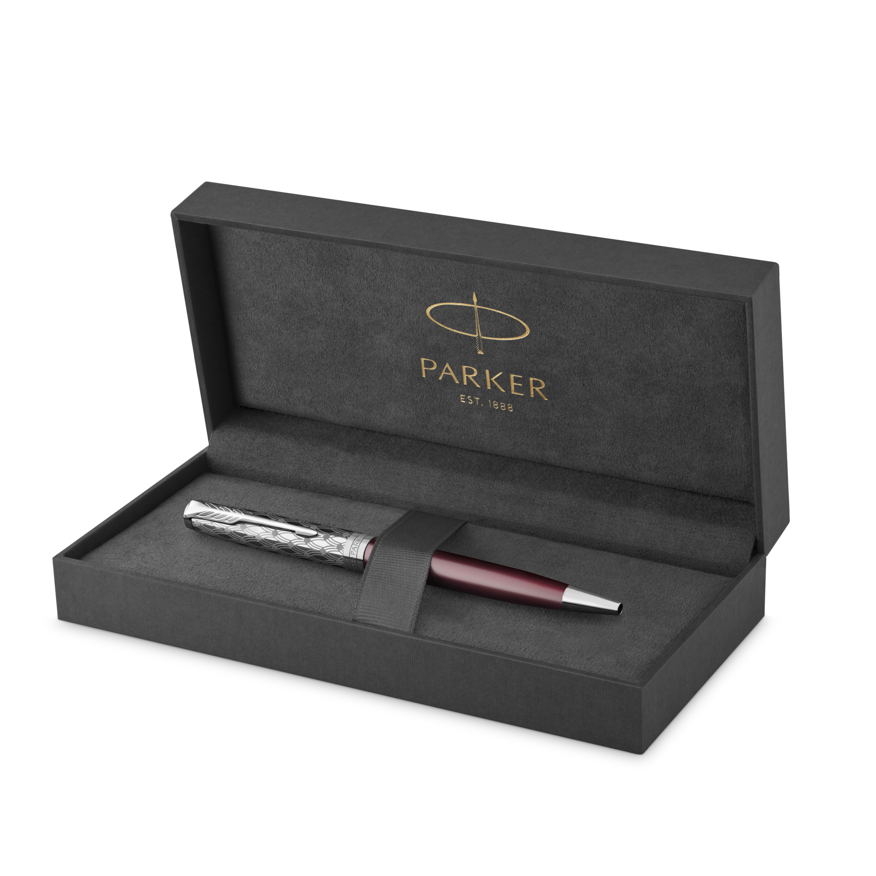 Stylo bille à mécanisme à rotation. À travers toute une variété de styles, y compris l’indémodable motif ciselé, le souci du détail dont cette gamme fait preuve est le reflet d’une sophistication que vous ressentirez à chaque fois que vous écrirez. Le Sonnet métal et rouge incarne l’expression classique du raffinement et de l’élégance. Orné d’un verni rouge satiné et d’habillages à la finition palladium. Son capuchon en argent met en évidence une gravure raffinée au style Art déco qui reflète la sophistication que vous ressentirez à chaque fois que vous écrirez. Acier inoxydable + verni rouge + laser + verni satiné translucide. . Grâce à sa fluidité, ses lignes claires et sa facilité d’utilisation, la recharge roller Quink, disponible en encre noire, vous offre un maximum de contrôle pour un minimum d’effort à chaque utilisation. Fabriqué dans le centre d'excellence de Saint-Herblain (44. France)