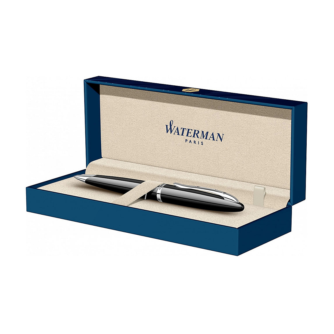 Stylo bille à mécanisme à rotation. Attributs plaqués argent. Corps et capuchon laque noire. Livré dans son écrin luxe et avec sa garantie Waterman. Stylo fabriqué en France dans le centre d'excellence de Saint-Herblain (44).