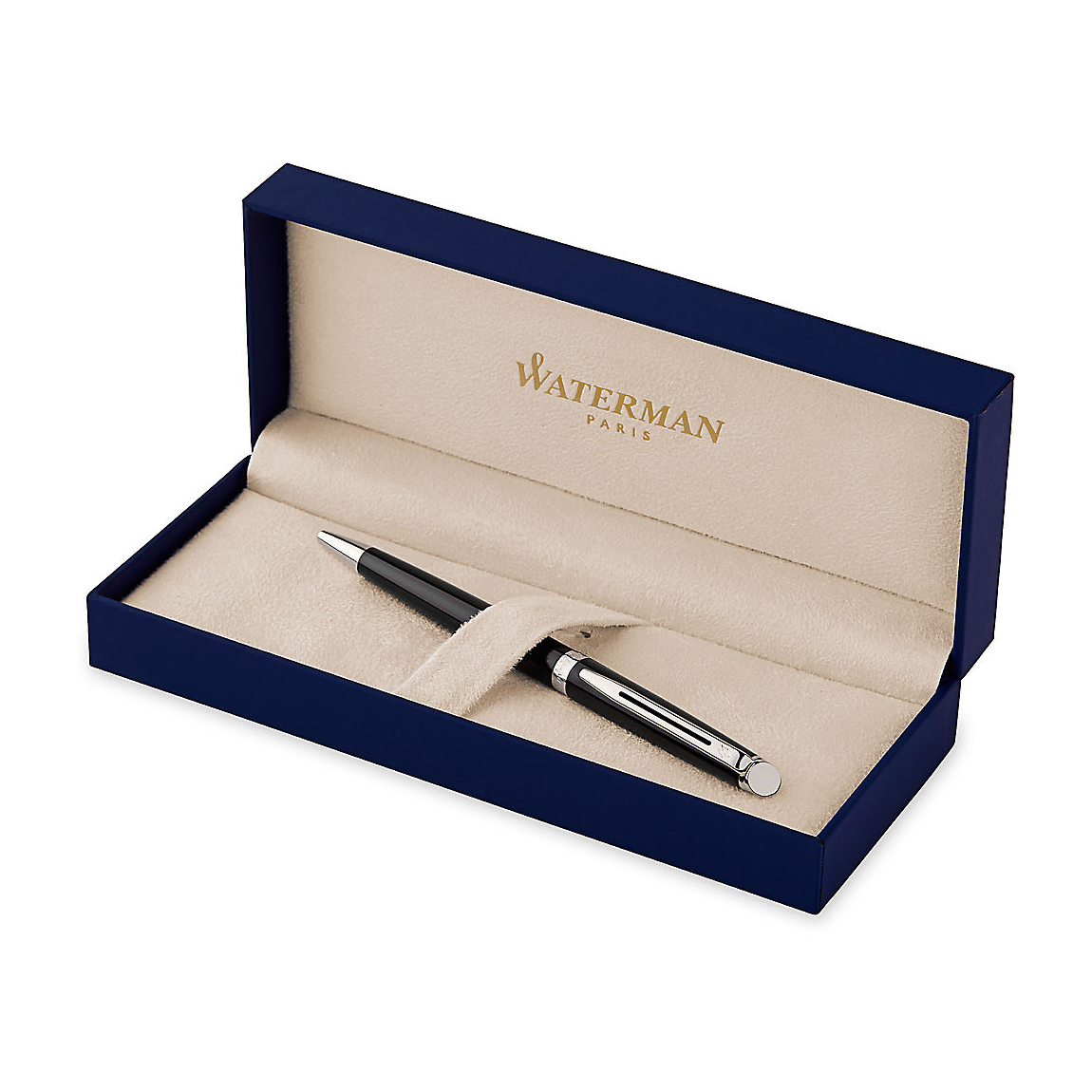 Stylo bille à mécanisme à rotation. Laque noire. Attributs chromés. Livré dans son écrin luxe et avec sa garantie Waterman. Stylo fabriqué en France dans le centre d'excellence de Saint-Herblain (44).