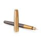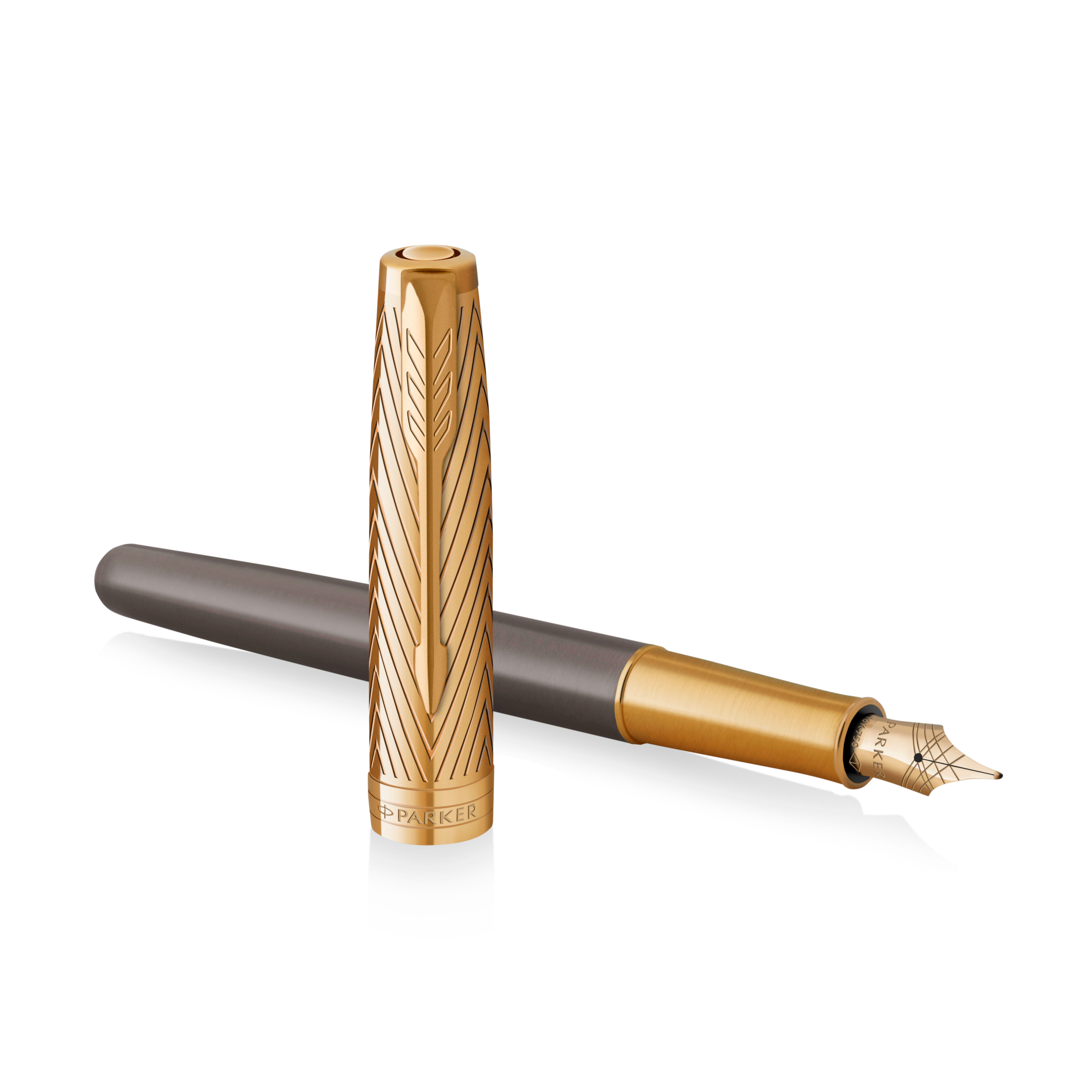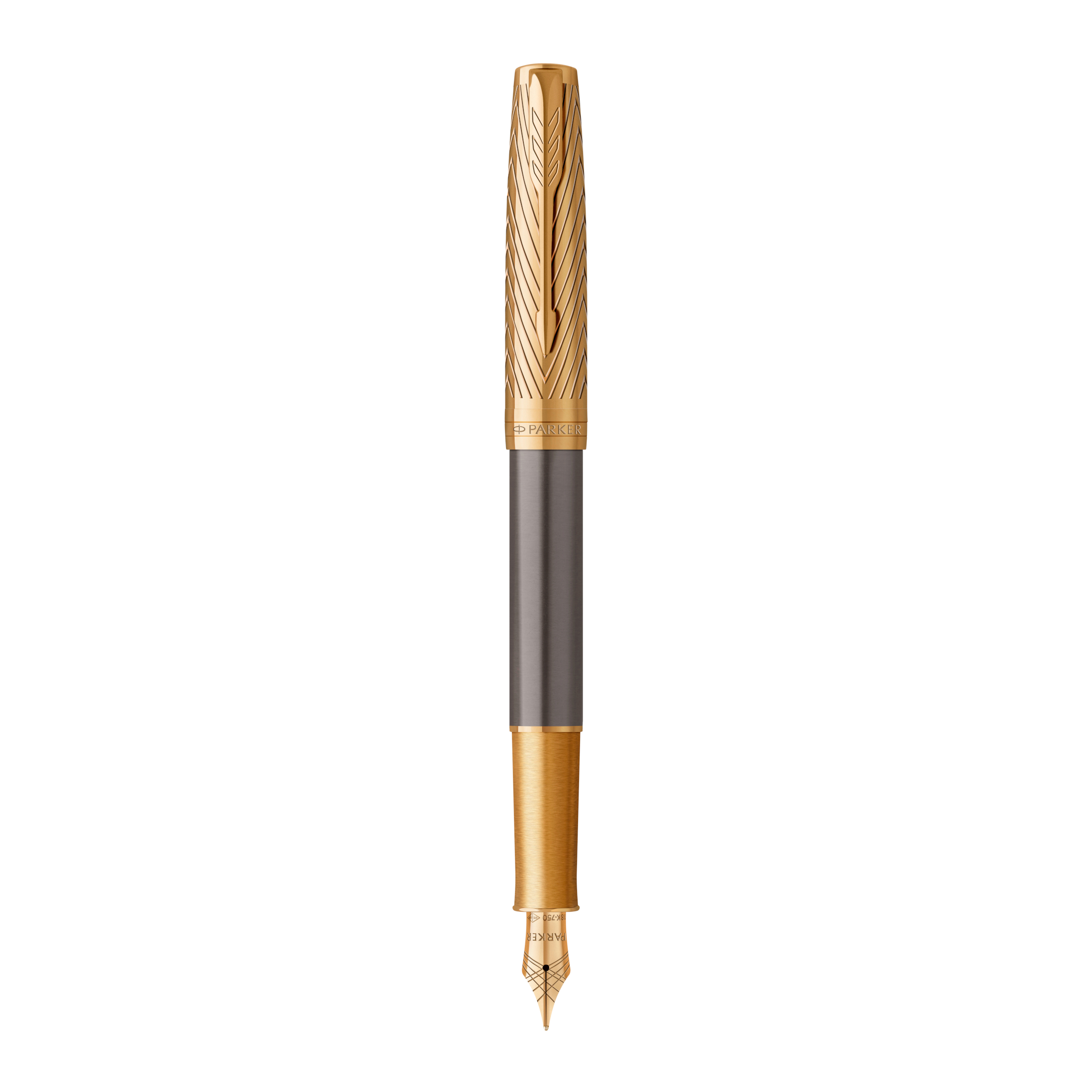 Stylo plume Parker Sonnet Collection Parker Pioneers, Laque grise avec capuchon et finitions or, Plume fine en or massif, Encre noire et convertisseur. Ancré dans les valeurs Parker, le capuchon délicatement gravé du Parker Pioneers fait écho à la fameuse flèche orientée vers le haut, symbole de l’état d’esprit avant-gardiste de George Parker et de son attitude de pionnier. Finition or 23 carats. Il se compose d’une plume en or massif 18 carats ainsi que d’un capuchon et de finitions en or plaqué 23 carats, le tout complété par un corps gris laqué. Assemblé à la main et qualité contrôlée sans défauts. Rechargeable avec un convertisseur et compatible avec les cartouches et les flacons d’encre Parker. Ce modèle Parker Sonnet est présenté dans un prestigieux coffret cadeau Parker, avec un manchon rehaussé du fameux motif chevron. Outre le Sonnet, le coffret comprend également deux cartouches longues d’encre noire et le livret de garantie.