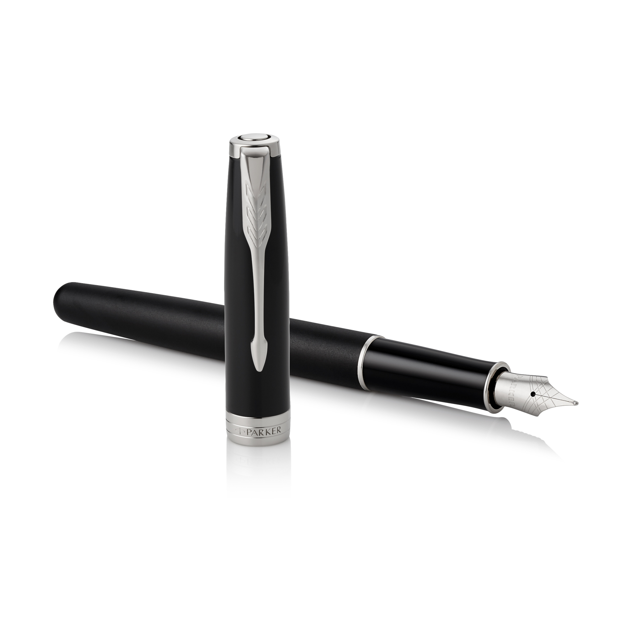 Stylo-plume Sonnet Noir Mat. •Symbole intemporel de l'élégance Parker. Corps et capuchon avec poudre de résine noire mate effet satiné. •Plume en acier inoxydable finition platinium. •Agrafe en forme de flèche et attributs finition chromée. •Taille de la plume : fine. Stylo fabriqué en France dans le centre d'excellence de Saint-Herblain (44).