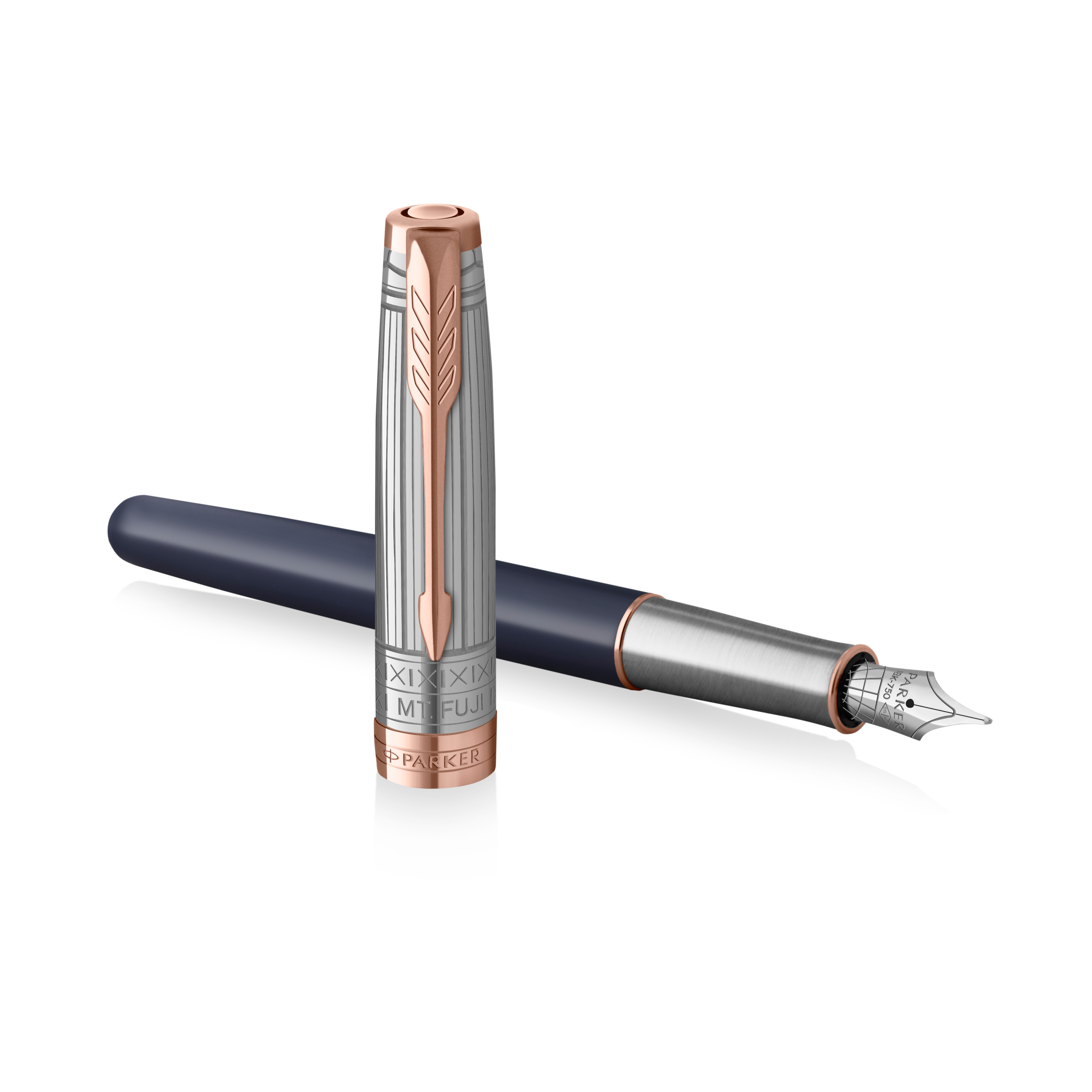 Chaque stylo est confectionné avec un souci minutieux du détail et présente une plume en or massif 18 carats rehaussée d’une finition rhodium, une surface en acier brossé soulignée de finitions or rose et un corps habillé d’une nouvelle laque bleue.