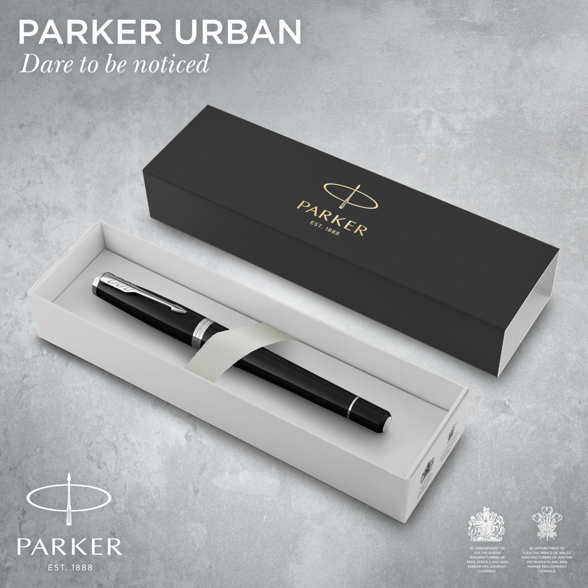 Magnifique stylo plume à cartouches. Laque noire. Attributs chromés. Plume acier. Fermeture du capuchon par encliquetage.