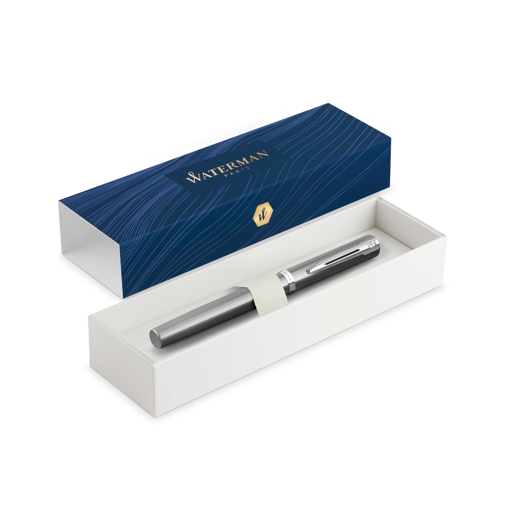 - Une silhouette élégante dotée d’un corps et d’un capuchon rehaussés d’une finition en acier inoxydable brossé. Le clip Waterman emblématique à double branche et un large anneau plaqué palladium sur le capuchon confèrent une distinction raffinée à ce magnifique instrument d’écriture.