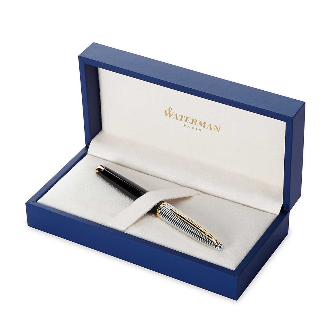 Stylo plume à cartouches. Plume or 18 carats. Un instrument d'écriture raffiné et moderne. Attributs plaqués or. Capuchon plaqué argent. Livré dans son écrin luxe et avec sa garantie Waterman.