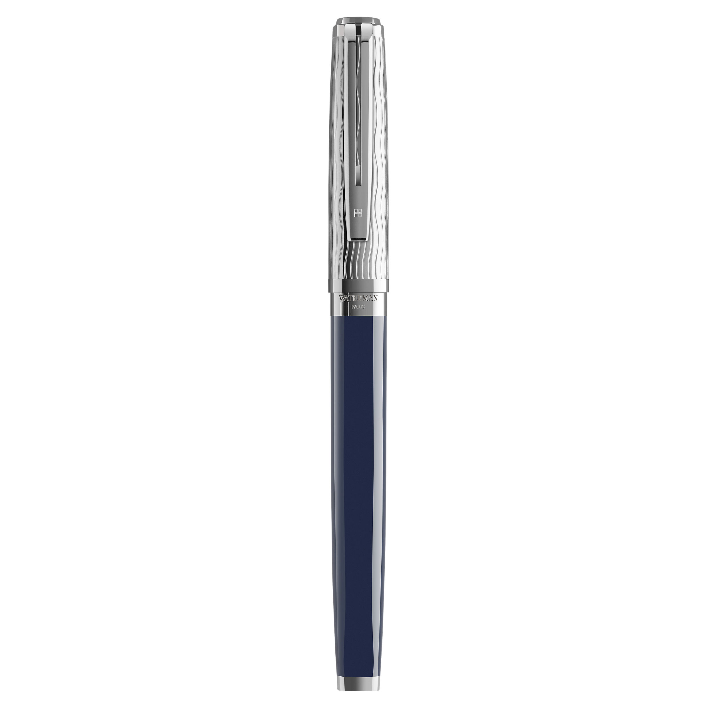 • Waterman emblématique laqué bleu profond sur corps, motif de vague gravé sur le capuchon et capuchon plaqué palladium pour une finition haut de gamme