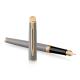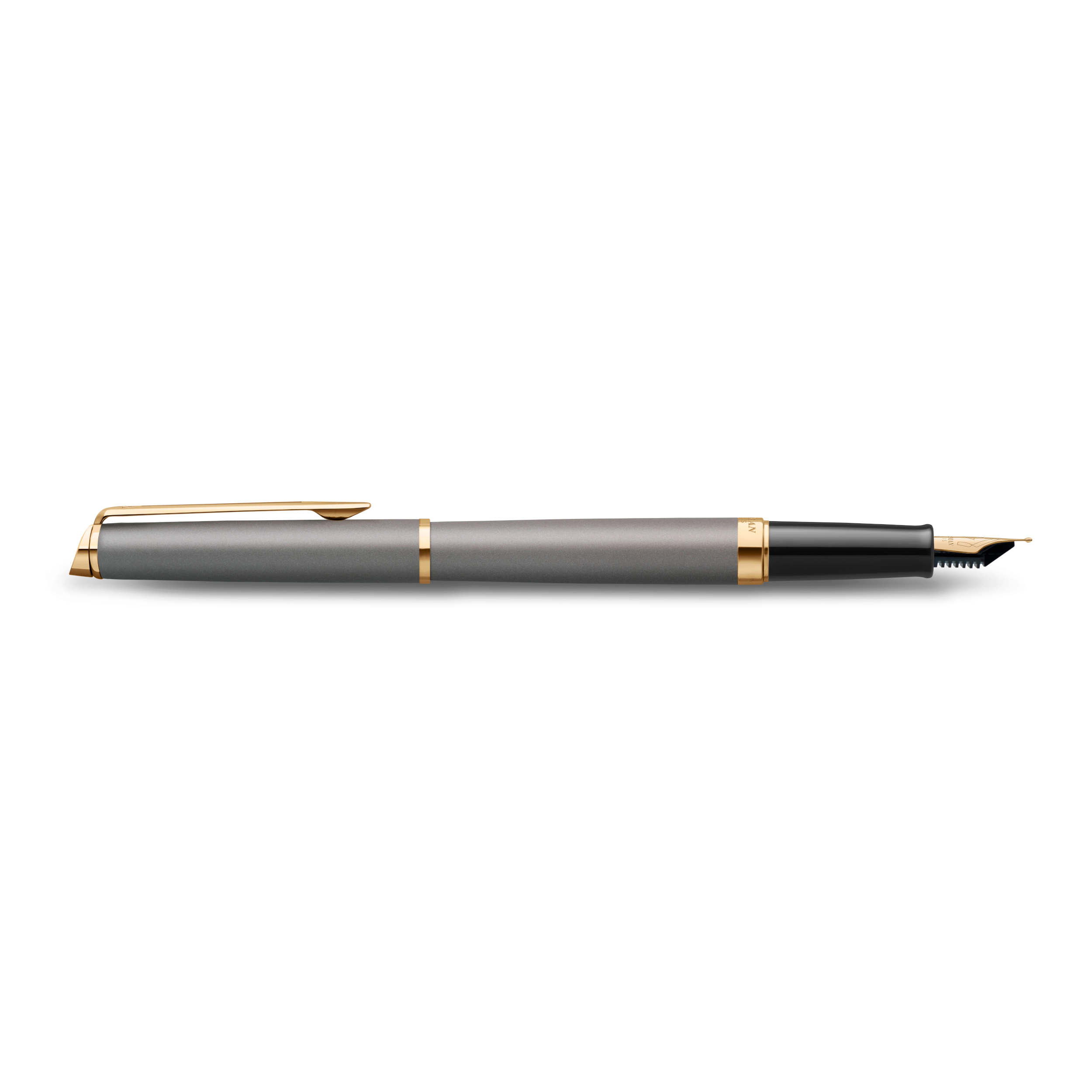 Corps et capuchon gris pierre finis en laque métallique, clip et finitions à double branche, recouverts d’un plaqué or clair