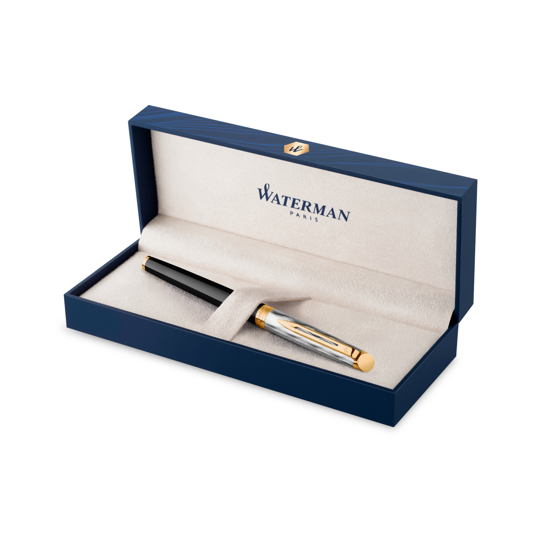- La plume en acier inoxydable plaqué or ornée de l’emblématique logo W en boucle de Waterman rend l’écriture encore plus fluide.
