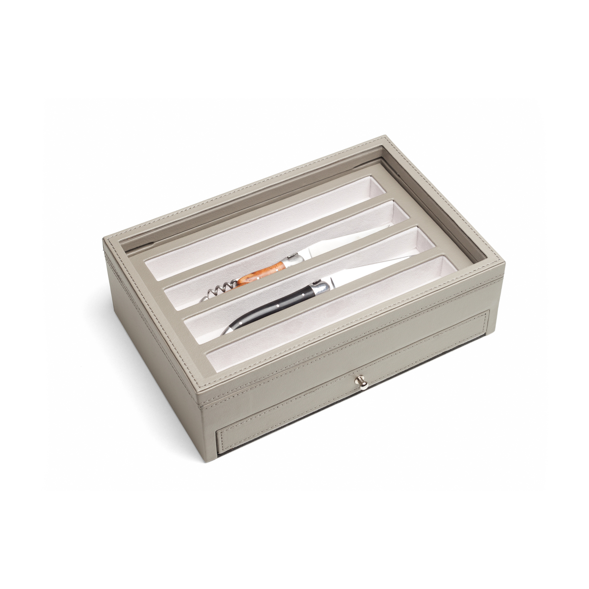 Pour les collectionneurs, un coffret unique pour ranger 8 couteaux, même de grandes tailles. Réalisation soignée en cuir de vachette pleine fleur. 1 tiroir sur la partie inférieure, dessus avec rabat vitré et charnières chromées. Espaces couteaux : 2,7x2,7x22,8 cm. (Livré sans les couteaux présentés) Disponible en 2 teintes : noir ou gris/taupe.